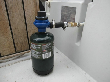Il faut savoir qu’en Amérique du Nord, on ne trouve pas de Butagaz. Nous avons opté pour la solution suivante:’adapter un détendeur pour les petites bouteilles de propane sur notre installation.
