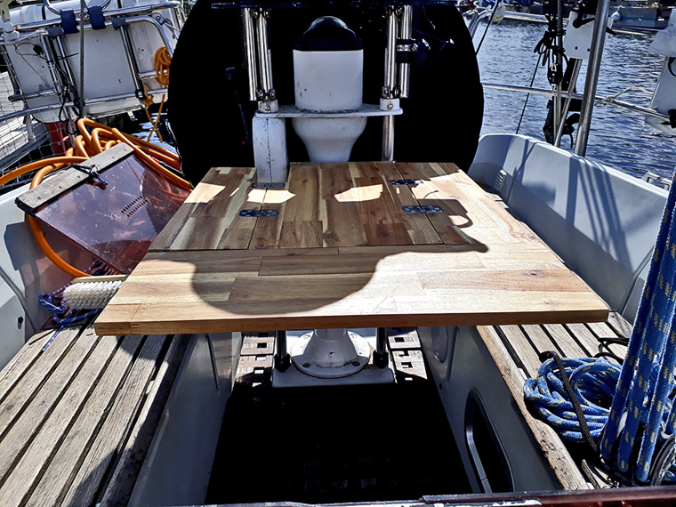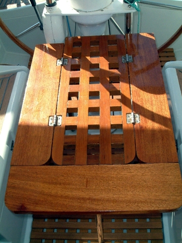 Une petite cale Iroko dans le caillebotis pour que la table ne batte pas dans les vagues :