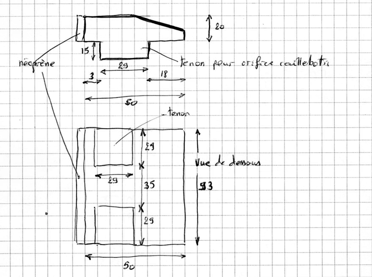 Pour une table de 60 cm de longueur ; on accrochera la platine à 67 cm de hauteur sur la colonne de la barre à roue. A cette endroit le tube de la colonne est conique aussi faut-il passer par la fabrication d’un gabarit dans une matière facile à travailler.