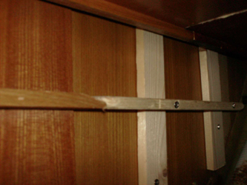 La seule difficulté consiste à tailler les tasseaux qui vont supporter les prolongements de glissières (voir photos) car bien entendu, pas un seul de ces tasseaux n’aura la même largeur ! En effet le chantier a crée une espèce de « boite » carrée qui contient les parois sur lesquelles sont fixés les glissières et les tiroirs mais en arrière de cette « boite » plus rien. Cela impose donc de fixer des tasseaux qui vont faire office de cales d’épaisseur pour la fixation des prolongements de chacune des glissières :