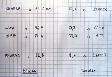 - Pour une grande précision de la tension des haubans, on peut mesurer au pied à coulisse, l'espace entre les embouts, pour chaque ridoir. Cette précision est inutile si on remplace le gréement, auquel cas il faudra de toute façon refaire un réglage des positions et tensions sur le mat.