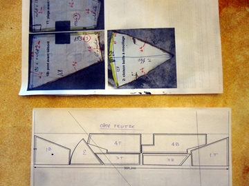 J’utilise les plans que j’ai préparé pour chaque pièce, pour me souvenir quelle marge garder autour de l’ancienne pièce pour dimensionner le nouveau, en tenant compte des ourlets, des 4 cm de sécurité sur les côtés libres, des coutures, des recouvrements, et des indications que j’avais marquées sur l’ancien vaigrage avant son arrachage.