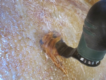 - Avec la disqueuse et ce disque abrasif, j'enlève toutes les irrégularités et grains de colle sèche et dure, mais inefficace pour la Néoprène encore molle.