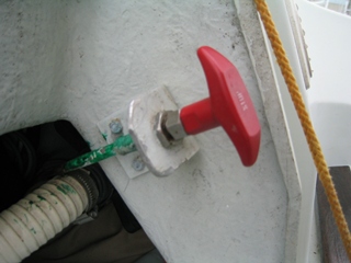 La commande d'arrêt du moteur diesel était, comme sur la plupart des Feeling 1090 équipés d'un Yanmar, située à l'intérieur du coffre tribord du cockpit. Pour actionner la tirette, il fallait ouvrir le coffre et faire attention qu'aucun objet lourd ne déforme le câble de commande allant de la tirette au moteur.