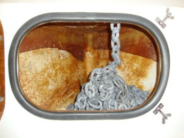 L'ancre tient dans la baille à mouillage, alors que la chaine descend dans ce qui était la cabine avant.
