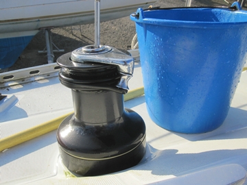 Quand le winch est bien sale et qu'une boue de sable et de graisse s'est formée, je commence par un premier nettoyage à l'eau savonneuse: eau + détergent ménager. Si la propreté du winch le permet, on peut s'affranchir de ce pré-lavage et passer directement au nettoyage au gasoil.